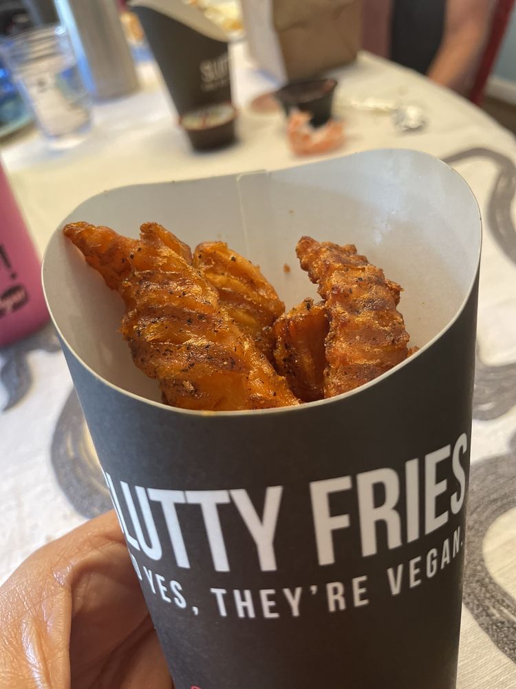 Plant based burger patty loaded with vegan jalapenos, vegan cheese, caramelized onions, lettuce, tomato, and slutty sauce on a vegan Hawaiian bun. Slutty Fries included