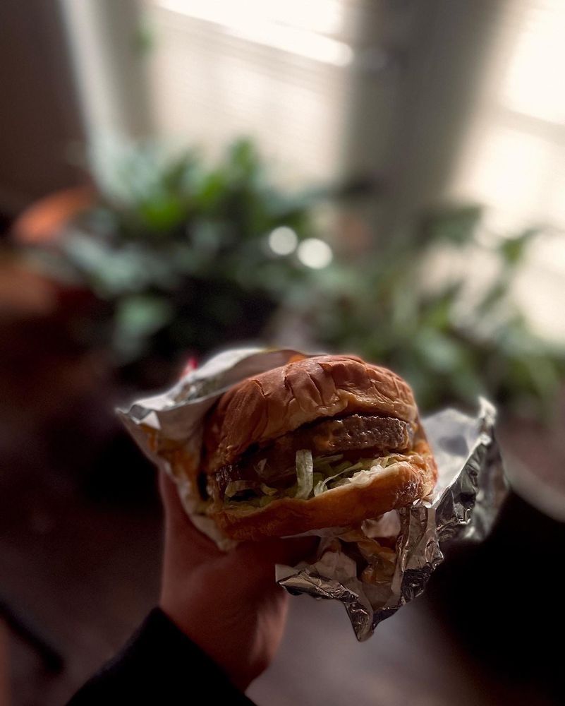 Plantbased patty loaded with vegan bacon, vegan cheese, caramelized onions, lettuce, tomato, and our Slut Sauce on a vegan Hawaiian bun.