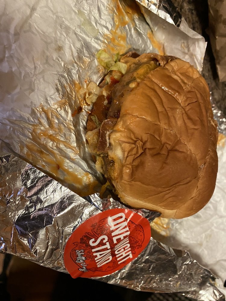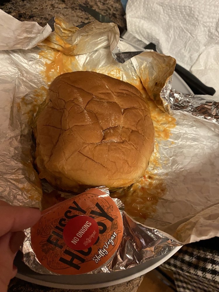Plantbased patty loaded with pickle, vegan cheese, caramelized onions, lettuce, tomato, and our Slut Sauce on a vegan Hawaiian bun.